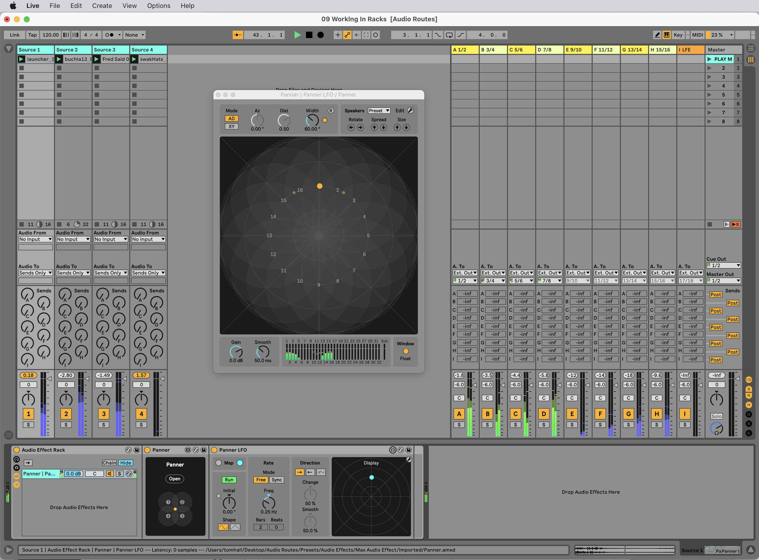 | Description: | A set of Max for Live devices and example sets that greatly enhance the audio routing capability of Ableton Live. Created by Manuel Poletti and Cycling '74, this system allows users to create new effects routings, side-chain effects, and even support surround systems with up to 32 channels. Using the new routing functions in Live and Max for Live, users can create additional aux busses (beyond Live's 12 sends), complex switching matrices, or step-sequenced multi-channel panning, and now fully functional inside Live Racks. New in Audio Routes v1.5 • Audio Routes devices now work inside Live Racks • Racks allow parallel routing chains and spatialization • Snapshot a complex chain into Live presets (although, in the case of multichannel routing, routings won't necessarily be retained in the context of another Live set with different outputs) • Audio Routes device automation transfers to other tracks when copying/pasting • Copy/Paste/Share routings where added to Rand Panner and Step Panner For technical support, email support@cycling74.com. Learn more about Audio Routes v1.5: https://youtu.be/tHBD50BWE0k https://cycling74.com/articles/audio-routings-a-new-system-for-multi-channel-routing-in-ableton-live |