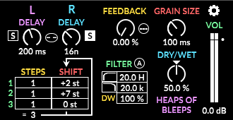| Description: | The Echo Arpeggiator is a pitched delay network which feeds your audio through 3 pitch shifted delays and then back into itself. Control each pitch shifter separately and create complex delayed arpeggios. You aren't limited to parallel stacking harmonies found in other pitched delays. Only the pitch shifter on the last delay stacks on top of itself when you turn up the feedback, so you can create pitched delays that don't get too out of control with the smallest amount of feedback. Just set the last shifter to 0. Create repeated arpeggiated chords by using values like (4, 7, 0) for the 3 pitch shifters and turning the feedback up. Make these chords stack at the octave by setting the last shifter to +12. In general I find +- 0, 5, 7 and 12 to be good settings for the last shifter (and all of them) to keep things relatively “musical”. Of course it's also musical to use weird values like +11 and +8, depending on what you want to do. The simpler the input sound is harmonically, the more adventurous I find you can be with the pitch shifters. Use the “Steps” parameters to create uneven rhythms with the delays. Set the time represented by 1 step at the top. The step times for the left and right channels can be unlinked and controlled separately (default) or linked together, with a spread knob to deviate the channels, and add some stereo. The delay time of this device is meant to be modulated, and gives a pleasing granular effect when you do so. Set the size of these grains with the “Grain Size” parameter. At low sizes you get squirrely granulary growls when you modulate the delay. At high sizes, you'll get slow morphing long grains. High and low cut filters in the feedback circuit. This gives you an extra control over unwanted high and low frequencies created by feeding pitched delays back into itself. Turn up the size of the delay buffer in the settings pop up window and you can have really long delays. If the settings button turns red, you have to make your buffer larger, if you want to delay your audio the full length. I left this in so you can have long delays if you want them, without wasting a bunch of RAM when you don't need them. Mono mode also available in settings to save CPU. Push integration and info-text for every parameter. Click free, except for parameters in the settings Pop Up window. Demo: https://www.youtube.com/watch?v=PUSSuBqBKs0&t=1s Now available in the Delays and Harmonizers pack. http://www.heapsofbleepsaudio.com/p/packs.html -Heaps of Bleeps |