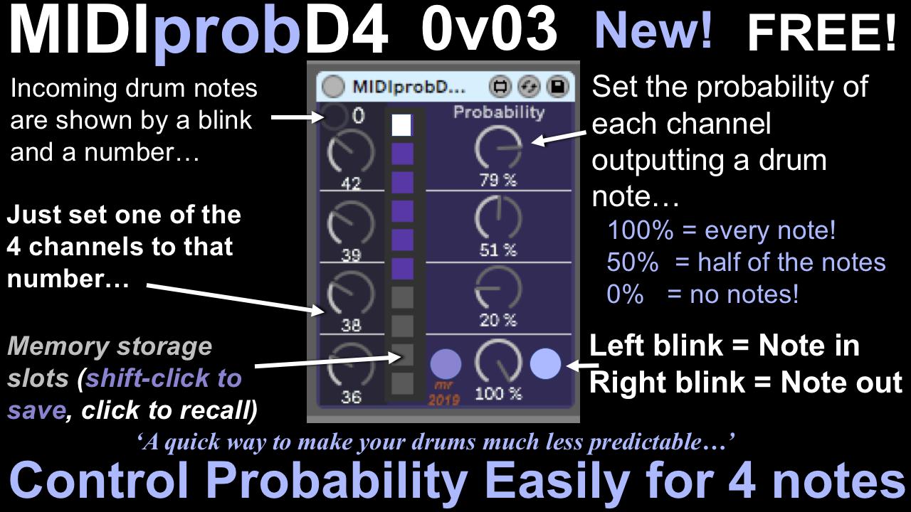 | Description: | MIDIprobD4 takes MIDI drum note events and controls their probability. If you want a hi-hat that is less predictable, then this will do it. Snares that aren't always on beats 2 and 4? - this is what you need. Incoming MIDI drum notes blink the indicator in the top left, and the MIDI note number is shown. Set one of the four channels to this number, and then choose the probability of that drum event happening with the rotary control on the right hand side. Purple indicators show all the incoming notes, whilst the light purple indicators light up only when a note is output to the drum Rack. 100% = every note goes straight through. 50% = half of the notes will pass thru. 0% = no notes will be output! Velocity just passes through unchanged, so all of your careful editing of accents is not affected. (This is work in progress. Sometimes the output indicator will flash will flash but no drum sound will happen. I've not been able to discover why this happens - maybe it should be thought of as a 'feature' and not a 'bug') Although published in Black Friday week 2019, there isn't any way I can give a discount - it is already free! Enjoy! |