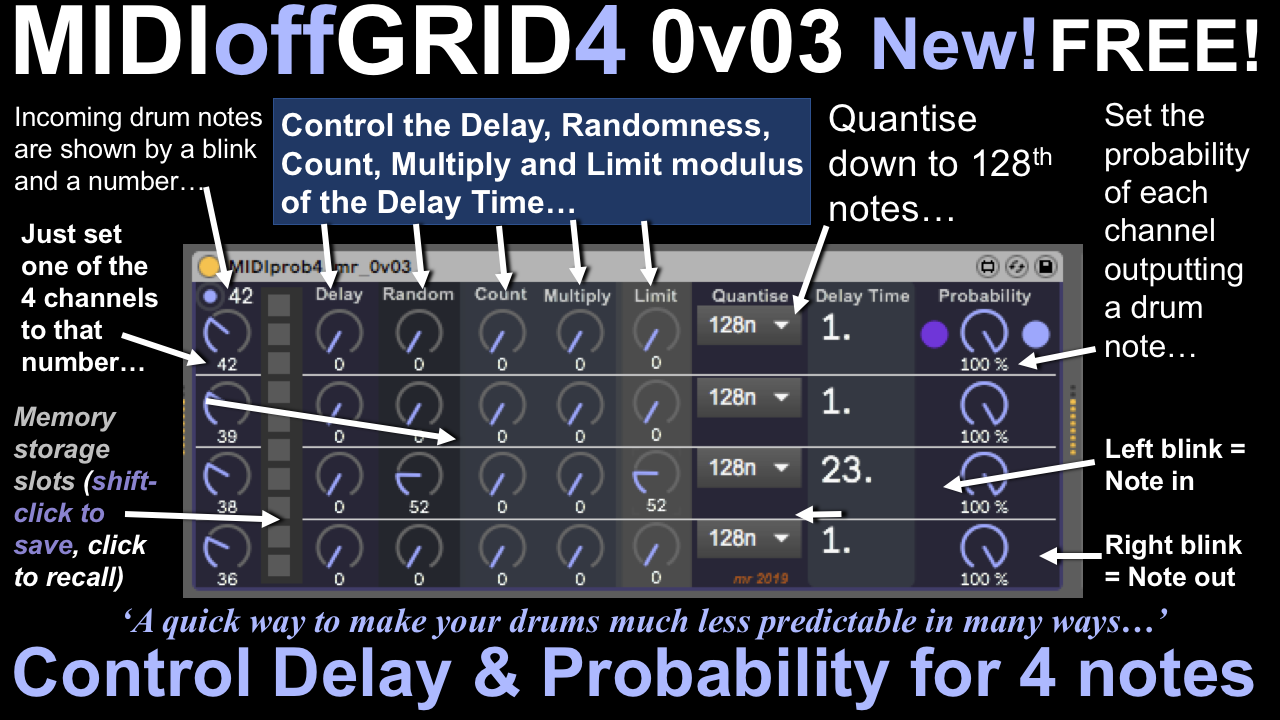 | Description: | MIDIoffGRID4 is a four channel time-delay and probability controller that affects only four selected MIDI notes. You have comprehensive control over the time delay (Offset, Randomness, Counter, Limit (modulo)), Quantisation and Probability of a note. If you want unpredictable drum events with variable timing, then this is what you need to try out. Released in the Black Friday 2019 season, this is already free! Have fun and enjoy! |