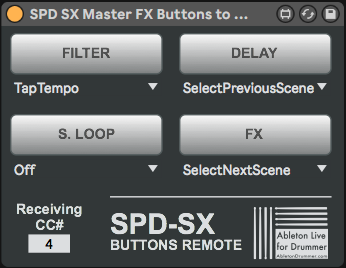 | Description: | You can use this device to control the inbuilt sound effects of your SPD-SX from within Ableton Live. This could mean you are using sounds/samples hosted on your SPD-SX or using the SPD-SX as an external sound card and running the audio output from Ableton Live via your SPD-SX. You can automate changes of those audio effects via Ableton Live. more info here: http://blog.abletondrummer.com/spd-sx-control-for-ableton-live-with-max-for-live/ |