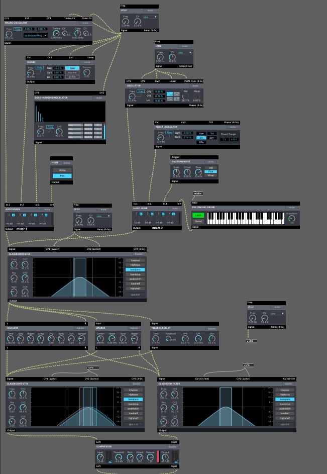 | Description: | This is a modular synth patch consisting of Beap modules available in Max. This instrument is primarily designed to make drones and noise. It uses in total 8 different sound generators that are connected to two 4-channel mixers. Both mixers are routed to the same multimode filter (we prefer the bandpass setting). The signal continues after the first filter to three parallel effects: the gigaverb, chorus and feedback delay. Stereo imaging is then created by routing the signal to one multimode filter for the left channel and to one filter for the right channel (here we also prefer and recommend the bandpass setting). In the final stage the signal passes through a compressor for volume and dynamic range control. Many parameters in the patch can be modulated with LFOs. In order to access and play the instrument you need to click the edit button in the upper right corner of the device. This will open the Max editor. Check out our tutorial video on the youtube URL below for some further instructions, or leave us a comment/question here. We hope you like the sound as much as we do (we are Henri Falk & Marco Timossi) and hope you will find it useful. We invite users to change and expand the patch and upload new versions. |