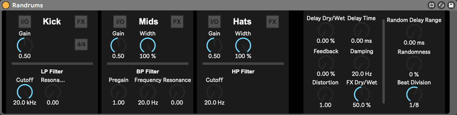 | Description: | This is a collaborative project created by Michael and Estaban at dBs Music Berlin for a school project. Randrums is a drum synthesiser instrument based on randomness. It has 3 separate drum synth segments along with an FX/Master panel. Each of the synth segments occupies its own space in the frequency spectrum (lows, mids and highs). The 'Kick' and 'Hats' segments both have one synth each while the 'Mids' segment contains 3 (a snare, a clap and a tom) and will randomly choose which one of them to play. Each segment also has it’s own dedicated filter, a low-pass, band-pass and high-pass filter respectively. These can be used to carve or shape the sound for a greater effect. Each segment can be turned on/off (I/O button) as well as be sent to the FX chain (FX button) individually. The 'Kick' segment has an added '4/4' button which forces it to trigger on every beat, regardless of whether the segment is turned on or off. The FX chain consists of a delay and a distortion. The delay has it’s own low-pass filter, whose cutoff can be controlled via the 'Damping' parameter. This can be used to reduce high frequency harshness or to add tonal quality. On the master panel, the 'Random Delay Range' parameter is used to control the range of a random delay time that is added to every individual drum trigger. The 'Randomness' parameter increases the range of randomness of various individual values of the synths themselves. Bringing this parameter down to 0 resets the synths' parameters to determined values. The 'Beat Devision' parameter tells the instrument on which devisions of a bar each synth trigger should happen. So, for example, 1/8 would mean one trigger per 8th note. The instrument uses incoming MIDI note on/off and pitch data. While a midi note is active the instrument will send triggers every beat devision to a random synth segment that is currently switched on. The pitch of the note is used to tune certain synths to that note. Note that the tuned synths are restrained to specific octaves. This means, for example, that sending a C-6 and C-1 MIDI note to the instrument will both cause the Kick to play at the same frequency. |