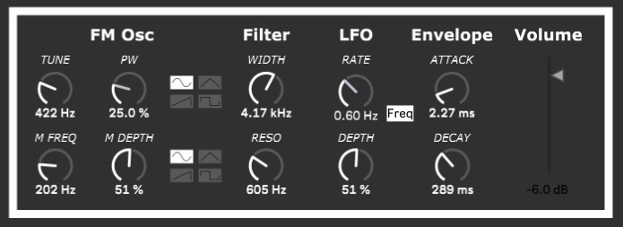 F.M.B.P.S. (FM Beap Percussive Synthesizer) it's a Beap based simple but effective virtual emulation of a monophonic FM synthesizer. It includes a carrier oscillator with tune and pulsewidth controls and four different switchable waveforms between sine, triangle, sawtooth and square. A modulator oscillator with parameters for modulation frequency (M FREQ), depth (M DEPTH), and waveforms. 24db Ladder filter with controls for frequency and Resonance. LFO with syncable rate and depth and an envelope with controls over short and longs attack and decay times to shape the sound from thick basslines to fast percussive shots.