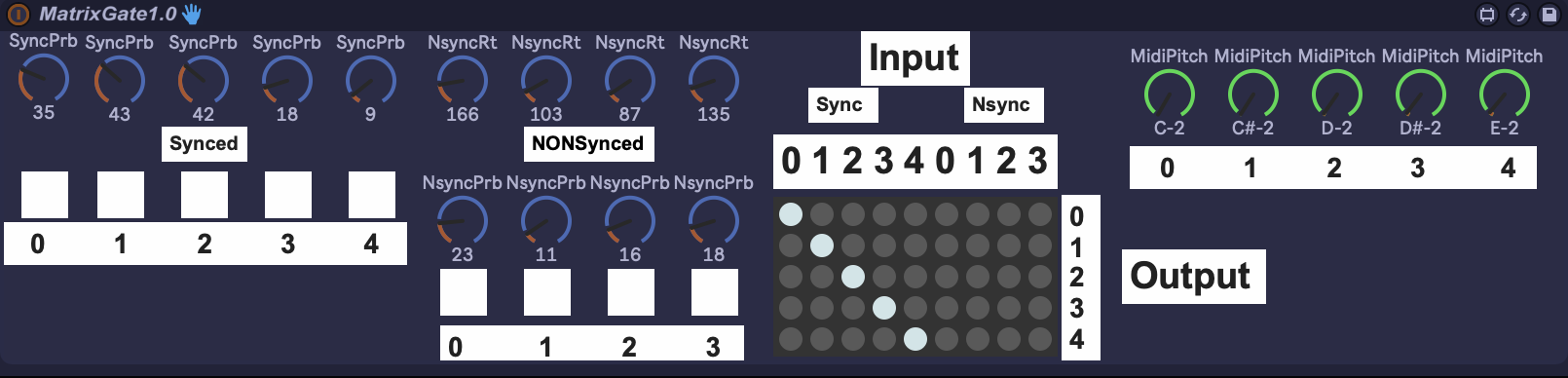 | Description: | This device lets you combine probabilistic gates to form unusual rhythms. There are 5 synced gates and 4 non synced gates so you can mix and match to form on-grid and off-grid patterns. if you like this plugin, please donate: https://www.paypal.com/donate?hosted_button_id=GRN7X2DQQQVCW |