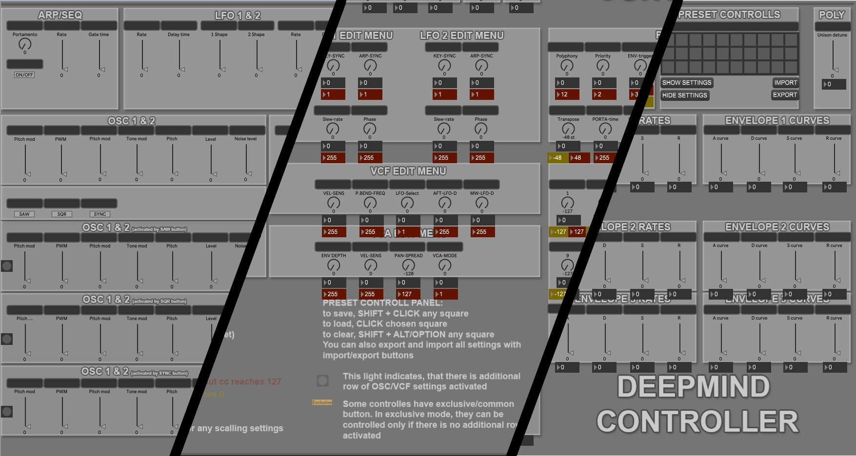 | Description: | Put this little device on any midi track, to transform your deepmind into powerfull midi controller. Remember, to set your deepmind USB or MIDI settings into NRPN mode, instead of default CC. There is a video in the description, showing how to use it, but lets do quick recap: -You can set any slider, button and menu option to any CC number, with optional scalling -You can save and load (aswell as import and export) presets, to controll multiple different devices -You can load multiple instances of that plugin and work only with armed track -You can use additional "sliders pages" with oscillators and filter buttons -Its tested only on Deepmind 12D, if you'll find any issues working with other versions of DM, let me know! michal.gitara@gmail.com If you like it, and want to support me with my future work and improvements, consider donation here: https://www.paypal.com/cgi-bin/webscr?cmd=_s-xclick&hosted_button_id=9BUY7JZY4T4XN&source=url Thanks! Hope you'll find that device usefull |