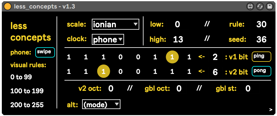 | Description: | 'less concepts' uses elementary cellular automata (CA) to scan sets of notes and determine which ones to play + when, by iterating a seed value through a set of simple rules. there are four classes of rules: - Class 1: rapidly converge to stasis (eg. rule 32) - Class 2: rapidly converge to repetition (eg. rule 108) - Class 3: longer-running + repeating (eg. rule 182) - Class 4: complex structure that has varying convergences (eg. rule 110) as you play, you'll find that some rules start off as very active and then terminate to silence (eg. rule 60). this is expected and intentional -- simply re-seed the rule and you'll get another burst of activity (great for flourishes). 'less concepts' is full of parameters that can be tweaked and modulated to create complex sequences out of very simple decisions. use the included PDF doc and `visual rules` aides to learn more. for new [phone] mode and other text boxes, check out @rjonline's devices: https://maxforlive.com/profile/user/rjonline00 --- this max for live version includes all the major functions of the monome norns script of the same name. it also has a unique feature set: - [olafur] mode: inspired by the self-playing pianos of Olafur Arnalds, [olafur] will bypass the chosen scale and will build note pools from direct keyboard input. just arm the track and play a chord. - [laurie] mode: inspired by Music Mouse by Laurie Spiegel, [laurie] will add chord voicings to your bit streams. choose a gating bit and enable '1' '2' or '3' for unique harmonies. - five text-based meta sequencers: using text operators, sequence/modulate/randomize all parameters to extend expressivity. --- the core functionality of 'less concepts' is adapted from Ezra Buchla's binary-centric implementation of CA in monome's Teletype eurorack module. to learn more about elementary cellular automata: http://mathworld.wolfram.com/ElementaryCellularAutomaton.html https://en.m.wikipedia.org/wiki/Elementary_cellular_automaton 'less concepts' is also an album: https://dndrks.bandcamp.com/album/less-concepts original artwork by Racquel Cable (IG: @biscotti.dippin) |