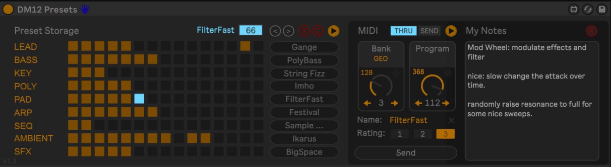| Description: | Organize up to 135 MIDI presets in categories, store them with a name, rating, annotations and send them to your MIDI device. FEATURES - Switch Bank (=Sub-Bank) and Program. - Switch between automatically or manually sending MIDI data to your MIDI device if Bank/Program is changed - MIDI preset may have optionally a user definable name - MIDI preset can be rated - Choose to let MIDI data through - Store and recall of a preset in preset slot - Presets can be organized on row level. Each row has user-definable label that you can adapt to your own liking, eg. sound styles or status of a presets - Last preset selection is save per category and can be recalled - Recalled presets are automatically send to your MIDI device - Clearing of all data or per row - MIDI preset section can be hidden in case you just recalling your presets. - Presets can be rated from 1-3 - MIDI send indicators - Continious program counter - Select next/previous slot in slot storage - Give your bank a meningfull name - The preset slot, bank and programm are MIDI mappable, UPDATES: v1.1 - Presets are now stored with your Ableton project or you can save it as a normal Abletone device preset (.adv files). Preset slots are automatically restored. The code is based on https://maxforlive.com/library/device/4286/mikado-base-save-patch-preset-with-live-projet. SPECIAL THANKS to spiralune for this really useful hack. v1.2 - NEW: Presents can be rated from 1-3 - NEW: AUTO turned on will automatically send MIDI data to your MIDI device if Bank/Program is changed - NEW: MIDI send indicators - NEW: MIDI CC/PGM can be filtered via switch - NEW: Linear Program Counter - NEW: Select next/previous slot in slot storage - NEW: Save last selected slot per category with name for quick recall - NEW: Clear data in a row - NEW: MIDI IN data will now change Bank and Program - CHANGE: Slot storage size changed to 15x9 - CHANGE: Some visual tweaks here and there - CHANGE: Some devices required Sub-Bank instead of Bank. Both are now set to equal value. - BUGFIX: Bank selection now working v1.3 - Added a selectable bank size that is used to calculate the Linear Program Counter (bank size * program number). - Banks can now have a user definable name - Added a mappable number field for the currently selected slot. - Added a field showing the current selected preset name that of the select preset slot. - Some UI tweaks v1.4 - Added a section to take notes. - Renamed 'Auto' to 'Send' |