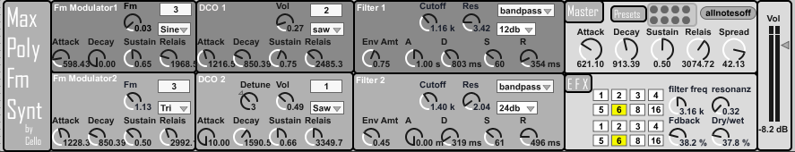 | Description: | 8 Voice Fm Synt. 2xFmModulator 2xDco 2xFilter PingPongDelay |