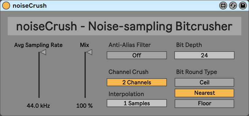 noiseCrush is a "Bitcrush" audio effect with a unique twist. Instead sampling audio at a consistent rate, a noise generator is used to sample audio when its value is below the threshold set which roughly corresponds to a frequency. The result is an aggressive and "noisey" sample rate reduction that is well suited to material with sharp transients such as drums, percussion, and rhythmic textures. |