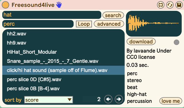 | Description: | Browse, search, listen and download sounds from Freesound.org without leaving Ableton Live. Video demonstration : https://www.youtube.com/watch?v=6SrgBE_nJJM&feature=youtu.be |