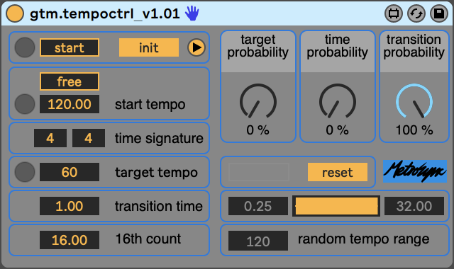 | Description: | I recently discovered that, while it is possible to map the Max for Live LFO device to Ableton Live's global tempo, doing so results in no audile change to the tempo despite the number changing visually. As such, I made gtm.tempoctrl, which affords a variety of ways in which to automate global tempo transitions in Ableton Live. Version 1.01 introduces ability to unlink start tempo from Ableton Live's global tempo, allowing it to be modulated/automated. Enjoy! Demo: https://youtu.be/pszP5CepGQQ |