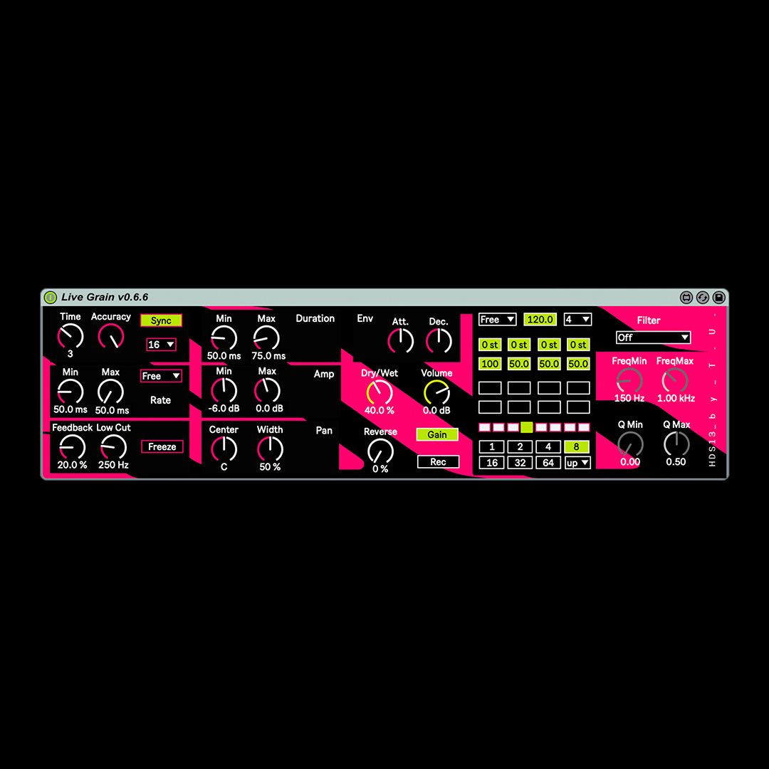 | Description: | LiveGrain is a real-time audio granulator effect that features two independent buffers to record incoming audio and to play it back in a granular stream. Its structure allows for a wide array of uses, from the generation of short and rhythmic delay feedbacks, cloud-like reverbs, up to intense audio manipulations. The device features 9 adjustable parameters that affect each individual grain (Delay, Rate, Duration, Amplitude, Pan, Envelope, Reverse, Pitch, Filter), as well as a global audio modulation set (Volume, Feedback rate and Dry/Wet control). Live Grain is the first HIDE device that incorporates other HIDE device macros (like NEXT and Simmer) to widen the modulation possibilities: a readapted NEXT macro allows to control Pitch variations with an internal sequencer, while a Simmer macro allows to record parameter/dial automation directly, with only a few clicks. Demo_01 https://vimeo.com/468540209 Demo_02 https://vimeo.com/468540726 Demo_03 https://vimeo.com/468541182 |