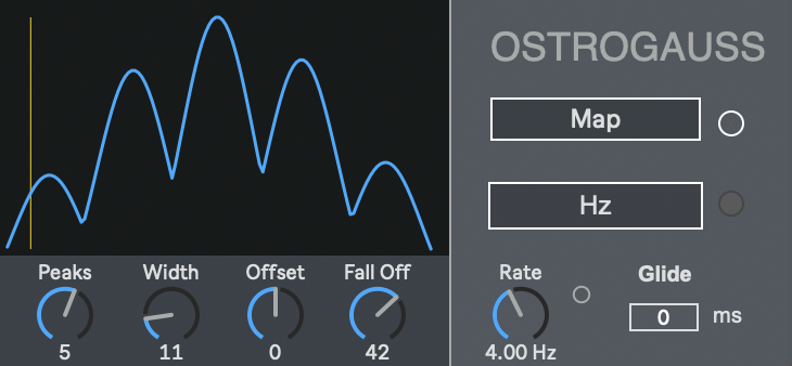 | Description: | Ostrogauss produces on demand pseudo-random values based on a combination of Gaussian distributions. This device offers a great way to introduce some drift in the control of Live parameters while keeping a certain level of direction. Change Log 1.1 – Fixed note pass-through system 1.2 – Added an alternate version for Audio Track |