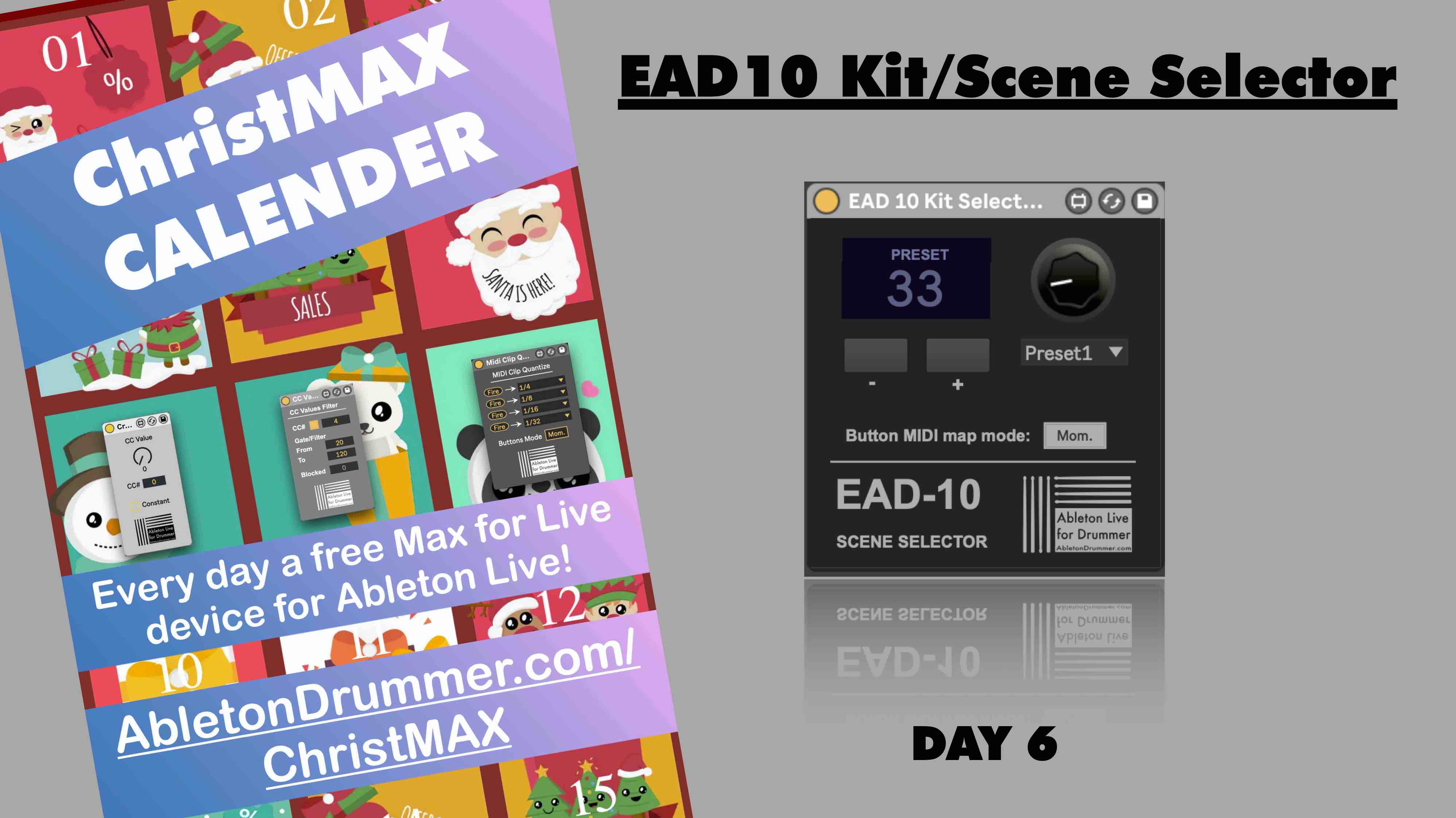 | Description: | EAD10 KIT&SCENE SELECTOR This Max for Live device lets you select and change scenes/kits on your Yamaha EAD10. You can set-up (drum) pads or buttons/dials from other external MIDI controllers to switch kits directly or to scroll through kits. You can as well set up envelopes in MIDI clips (Session View) or automations (Arrangement View) to automatically change kits during a live set. This device is part of the christMAX calender - one M4L device until every day - and free to download on the day of the release. Check out the calender here: https://www.AbletonDrummer.com/christMAX |