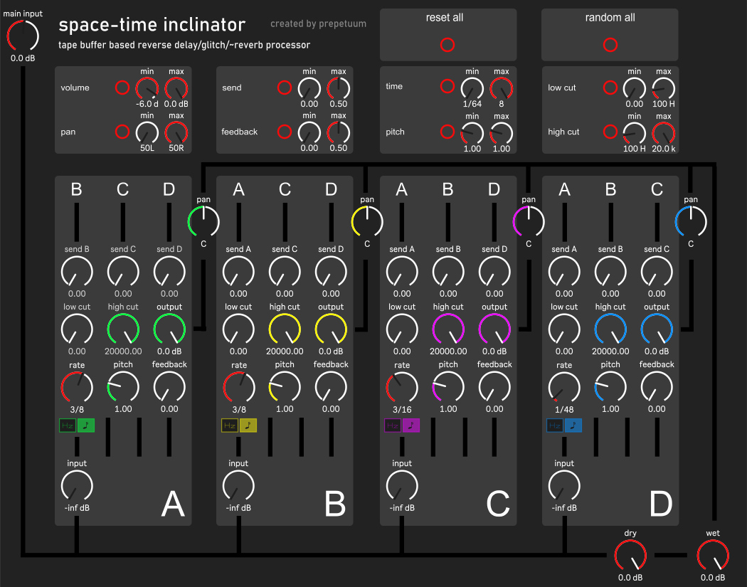 | Description: | Space-time inclinator is a 4 core revers delay effect which you can "wire" as you wish (send/feedback). There is a random generator in it and you can make random, weird, and crazy effects. |
