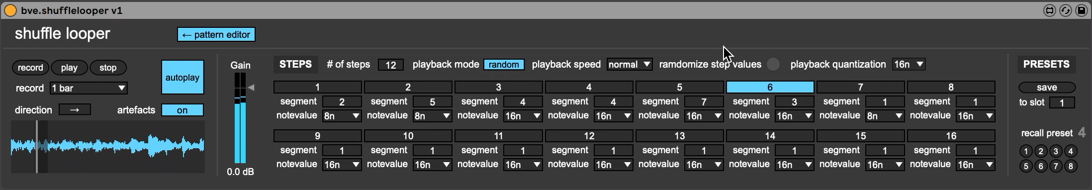 | Description: | Shuffle looper is a simple audio effect that shuffles the loop points in any recorded sound. Quick start: - Activate Live's transport, play a sound and hit "record". Shuffle looper will automatically start shuffled playback. - Edit segment details in the "pattern editor" - Save/load presets |