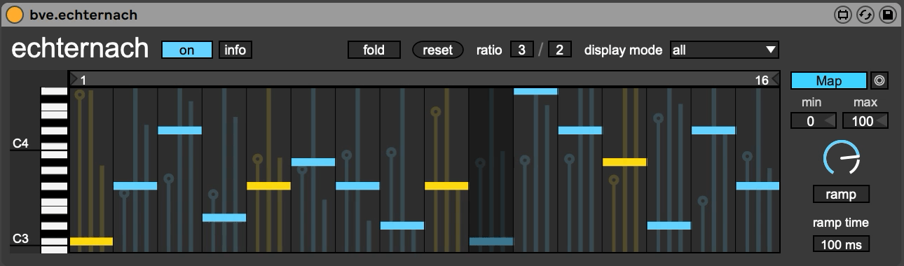 bve.echternach is a sequencer which progresses like the ancient Procession of Echternach, in which participants take three steps forward, followed by two steps backward, etc. The Procession of Echternach is an annual Roman Catholic dancing procession held at Echternach, in eastern Luxembourg. It is the last traditional dancing procession in Europe. The procession is held every Whit Tuesday around the streets of the city of Echternach. It honours Willibrord, the patron saint of Luxembourg, who established the Abbey of Echternach. |