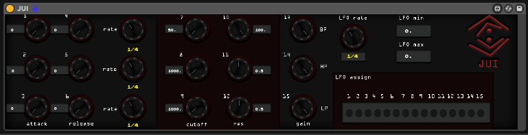 | Description: | JUI - Just use it. Active triple-filter with AR and assignable LFO. |