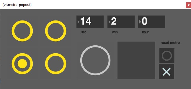 | Description: | Version 1.0 of Vismetro. Floating window 4/4 graphic metronome. Displays a hour/minute/seconds counter for as long as Live is playing. Stopping will reset the clock, but not pausing time. Circle counting display for 16 bar progress. Features a manual/auto switch for leaving the floating window open - or having it disappear when you move to a new track. Future Developments includes -adjustable meters (3/4, 7/8 etc) -switch between bars/beats and min/seconds -sexier design |