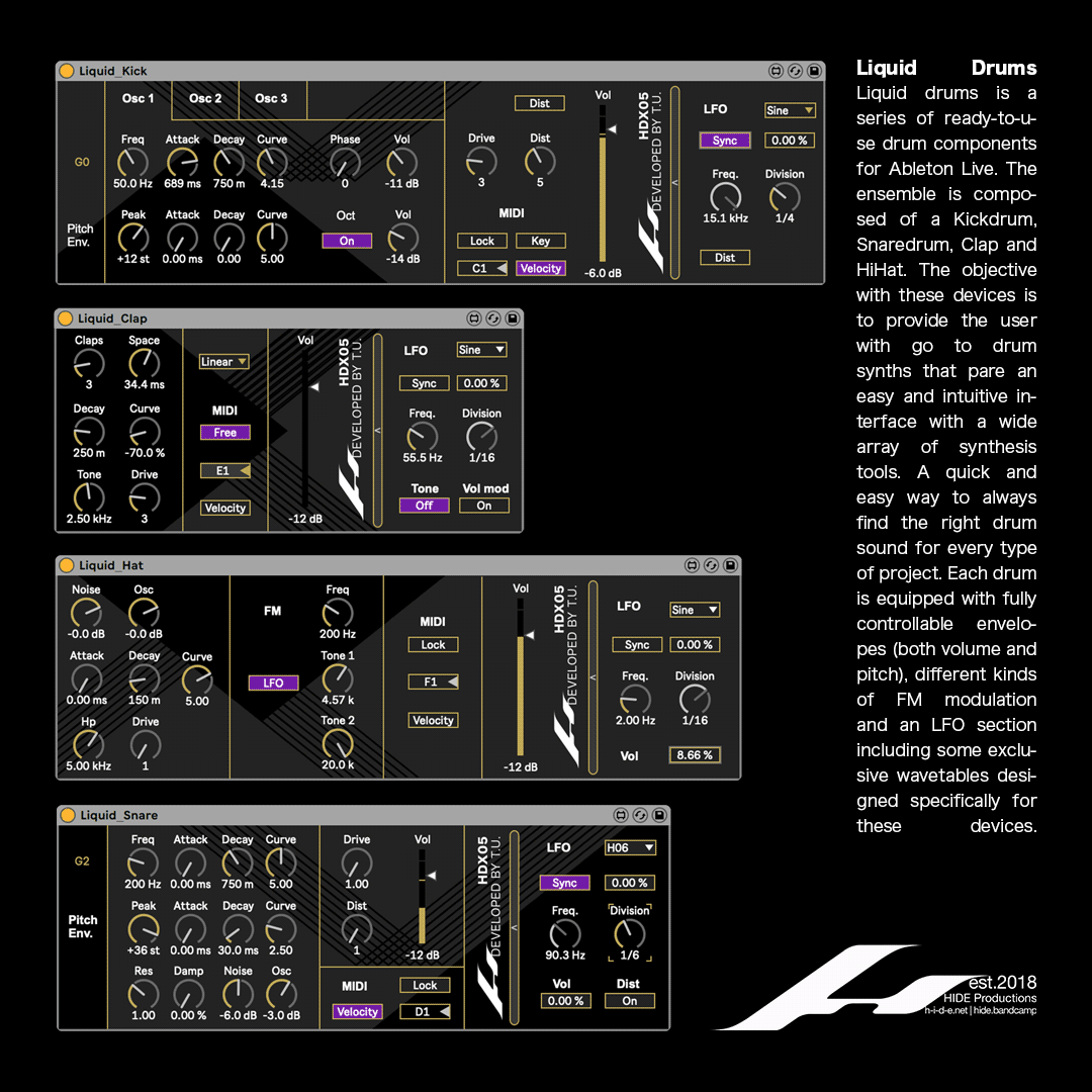 | Description: | Liquid drums is a series of ready-to-use drum components for Ableton Live. The ensemble is composed of a Kickdrum, Snaredrum, Clap and HiHat. The objective with these devices is to provide the user with go to drum synths that pare an easy and intuitive interface with a wide array of synthesis tools. A quick and easy way to always find the right drum sound for every type of project. Each drum is equipped with fully controllable envelopes (both volume and pitch), different kinds of FM modulation and an LFO section including some exclusive wavetables designed specifically for these devices. - Liquid Kick Liquid kick is a kickdrum synthesizer that features 3 independent oscillators, each with their own fre- quency, phase, volume and pitch envelopes. - Liquid Snare Liquid snare is a snaredrum synthesizer composed by a noise source and a sine oscillator with volume and pitch envelope. - Liquid Clap Liquid clap synthesizes clap sounds using multiple envelopes on a noise source. The number and spacing of the claps can be choose by the user, with additional controls for tone and decay. - Liquid Hat Liquid Hat is an HiHat synthesizer composed by a noise source and an oscillator. For additional sound design possibility the oscillator is being Frequency Modulated, with parameters for both frequency and amplitude of the modulator. Demos demo_01 https://vimeo.com/513915520 demo_02 https://vimeo.com/514716615 demo_03 https://vimeo.com/515174661 demo_04 https://vimeo.com/515177476 |
