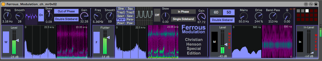 | Description: | Ferrous Modulation adds mains, wow and flutter frequency modulation to audio. It is intended to provide similar changes to an audio signal as might be heard in an analogue tape system. This is a companion effect to my Ironic Distortion effect (also available on this site), which is more oriented towards digital processing artefacts. The pair form the main parts of The Synthesizerwriter M4L Tape (etc.) Suite, and require only a saturation/device effect of your choice to complete a sophisticated audio degredation system. Because of his ongoing enthusiasm for guitar pedals, I dedicate this suite to Christian Henson (of Spitfire Audio fame). |
