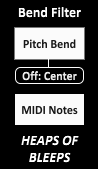| Description: | This device is a MIDI filter that allows you to separately filter out MIDI notes and Pitch Bend. When the toggles are on, MIDI notes or Pitch Bend is sent through, when off MIDI notes or Pitch Bend is filtered out. This is useful for different routing scenarios where you only want to send either Pitch Bend, MIDI notes, or only CCs between tracks. There's also another toggle which decides whether the Pitch Bend is re-centered after the Pitch Bend toggle is turned off or it is held. This device is a part of the Bend Series which allows you to modulate pitch bend in a variety of different ways ( https://gum.co/vYasM ). In that context it helps with setting up parallel MIDI chains, and making sure you don't have unwanted notes or Pitch Bend conflicting between the separate chains. Demos of other devices in the series: https://youtu.be/-Kyt215dBbw https://youtu.be/2Q2NfjYoqBM -Heaps of Bleeps |