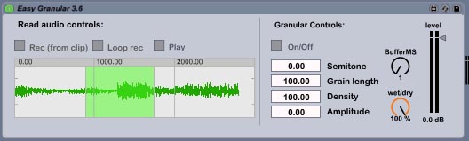 | Description: | Easy Granular is my first attempt to create a Max for Live patch. I have used Michael Edwards externals, (mdeGranular~) so the credit is for him. Video demo: http://www.youtube.com/watch?v=aFZVuRdYOOo Instructions -Install the patch in ableton live by drag and drop to the audio effects folder. -Drop an audio file into the live set. Play it. -Drop "Easy Granular" into the track. -Rec into the buffer of the patch with the "Rec button" -Activate the granular control parameter (ON) -Just play with the other granular parameters and turn the Dry/Wet dial to wet. --- Version 1.0 Red from clip Dry/Wet |