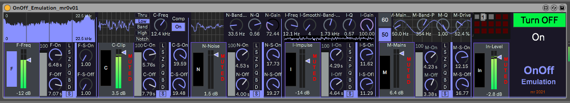 | Description: | Actually this is an 'Instrument' device (it generates sound) AND an 'Audio' device (it processes sound). It is effectively a custom synthesizer that attempts to emulate the results of turning an audio circuit on or off. So there are two processing sections that dynamically change the cut-off frequency or the clipping level of audio processing, plus three sections that add in some enveloped noise, impulsive 'crackles' and mains hum. I've never turned the power off to just a VST, so I'm not sure what would happen, but I've removed the power from audio hardware many times, both deliberately and by accident, so I have some first hand knowledge of the sort of things that can happen. When I was much younger, I had a tape recorder with valve-based electronics that used to whistle whilst it warmed up and cooled down, and I've had synths that did much the same, but without the benefit of vacuum tubes. I've never seen much discussion of this topic, and can't recall seeing any software that tries to do this type of simulation, but this doesn't mean that there aren't millions of keen explorers of this topic - it just means that I haven't met them yet. There is, as usual, more information about how to use this device, on my blog. |