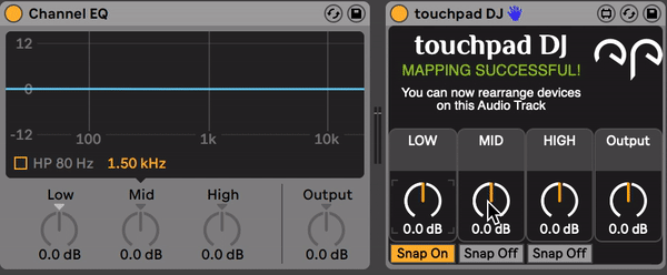 This Max4Live device automatically maps itself to "Channel EQ" and you can toggle SNAP with the click of a button. Snap will reset the knob to zero in 20 ms after you release it. The device works with a touchpad on your laptop or with a mouse. Save your gig with not having to stop the ongoing set, but still EQ precisely without a need for MIDI controller.