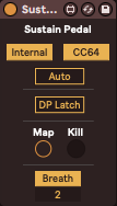 | Description: | Increase the control of your sustain pedal. Internal : Manage the note sustain inside the device, which will hold all Note Off messages until the pedal is released. Tip : use this in front of an arpeggiator or any MIDI device to play chords larger than 10 notes or for more keyboard-playing versatility. CC64 : Bypass or gate CC64 messages. Auto : In this mode, the "pedal" is automatically lifted and pressed down again on the first note of a new chord (in other words, the first note after no keys were pressed down). Useful when you don't have any pedal and don't want to manually manage the sustain. Double-Press Latch : If turned on, double-pressing the sustain pedal will latch all currently held down notes on keyboard. You can then play all other notes as usual with the sustain pedal. Double-pressing the pedal with no held down notes flushes all notes. Tip : useful for creating drone notes on-the-fly. Map button : Map any controller to this button to act as a sustain pedal. You can also click on it. Kill button : Kill all hung notes. Breath : When turned on, pressing the sustain pedal will hold the current breath/wind controller’s CC value as a floor/minimum value until the pedal is released, letting you catch your breath! |