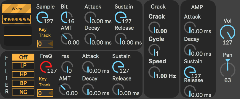 | Description: | This device can be chosen White/Pink noise and changed sample rate, filter and amp with ADSR. ver0.2 add key tracking and crack(Tremolo) 0.201/0.2.1 fixed color |