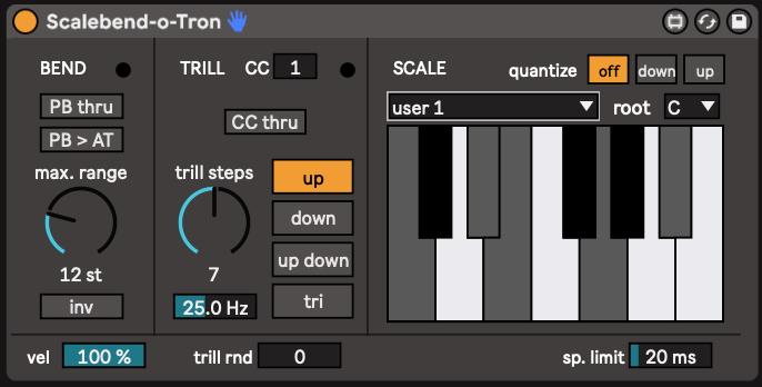 | Description: | The Scalebend-o-Tron transforms Pitchbend-Data into successions of discrete MIDI-notes. Its basic use is to facilitate glissando experiments. However, if you hook it up to percussive sounds, it's also capable of turning your pitch stick (or wheel) into a rhythm machine. A trill engine (controlled via Mod Wheel by default) enables you to create rolls or trills. If you need tonal control, it’s provided by the scale quantizer. Aside user scales and a selection of preset scales/modes, it features a "remote" mode: note data is fetched from any MIDI-track that contains the „Bend-o-Tron Transmitter“ device. |
