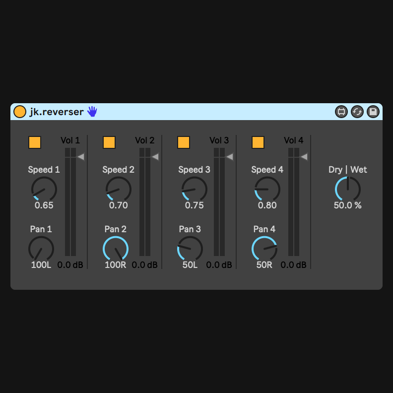 A simple plugin/patch: it uses delay lines to grab your audio input, either live or sample, and reverse it along with changing the speed, pan, and volume of the reversed bit if you want. Works great in Ableton Live or Max. |