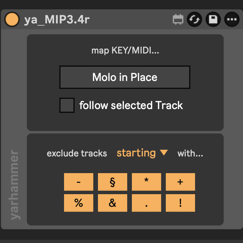 | Description: | ya_MIP (Molo in Place) allows true solo in place, even with the most complex routing setups. If you ever felt Live's solo was not working right for you… try Molo (for free). Version 3.2 allows multiple special characters to exclude tracks from molo. Version 3.4 plays nice with Live dynamic Theme colors. |