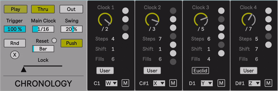 | Description: | Chronology is part of the SEEDS collection. A clock generator with up to four simultaneous outputs, each running at an assigned division of a common main pulse. Features manual and euclidean sequencing options for each clock output. Tutorials and more info here: https://www.novelmusic.org/m4l/seeds |