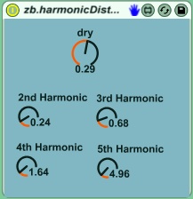 zb.harmonicDistortion uses de Moivre theorem to induce 2nd to 5th harmonic without the difference intermodulation frequencies. |