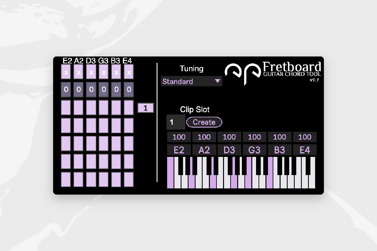 | Description: | Fretboard is a free Max4Live MIDI effect that is intended to help guitar players visualise their chord fingerings on a piano roll. All future updates are introduced on product page. You can use guitar chord shapes anywhere on the neck, play open strings and use the standard or any tuning, then select the clip slot and create a MIDI clip with your chord. https://youtu.be/H74vFernxLE |