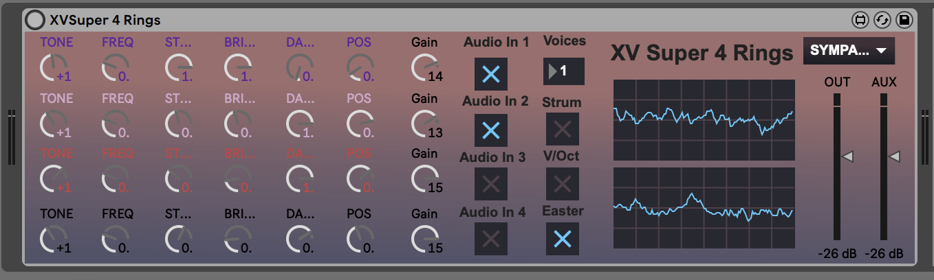 | Description: | Max4Live effect,Four stages of Mutables Rings device on 1 with control level for each row. Midi controllable. Only for Mac OS operative system. Buy it: https://monotalefx.gumroad.com/l/UblfT https://youtu.be/aVCQjcjaI-s Originally from Emily Guillet at https://mutable-instruments.net Code adapted for Max externals by Volker Böhm at https://vboehm.net Developed by Paulo Cominotti at https://monotale.com.ar |