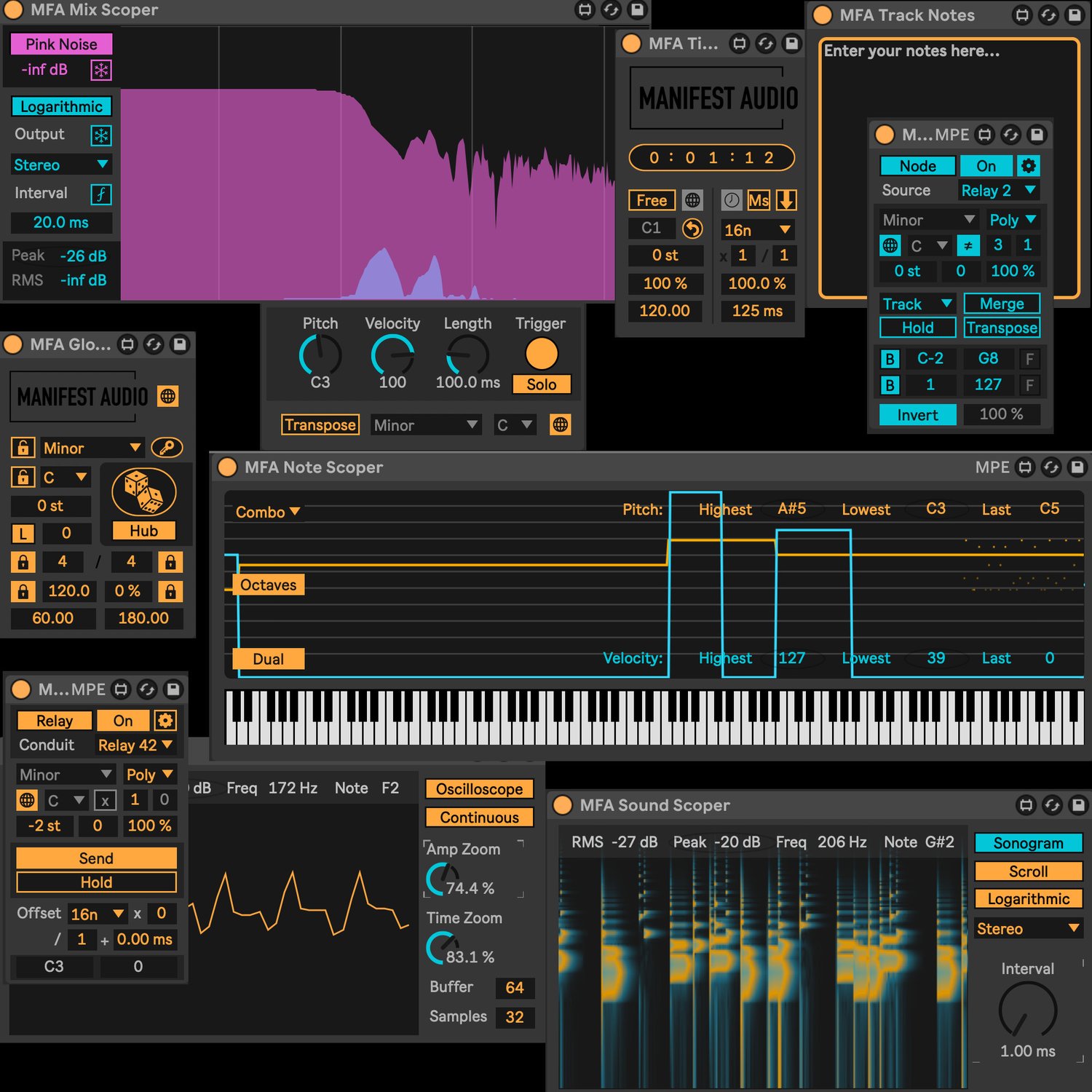 | Description: | Designed by Ableton Certified Trainer Noah Pred, Time Zone is a free time-based utility, allowing for unique BPM calculations for your entire set, and discrete timing calculations for musical elements – along with a real-time hours, minutes, and seconds counter. Time Zone allows calculation of harmonic tempos aligned with a selected key value. Base key will be inherited from an instance of Global Hub by default, but Time Zone can also be pinned locally to ignore Global Hub instances. Adjust the base key and watch the calculated BPM change as a result. You can also adjust Live’s current BPM in semitone steps – or via percentage slider. When you’re happy with the result, click the BPM display to send your calculated BPM to Live and reset the semitone and percentage sliders. You can also use Time Zone to easily calculate any possible metrical value in milliseconds or Hertz. Select a base metrical rate (16n, 8nd, 32nt, etc.), along with a multiplier, and optional percentage to output the resulting value in the display below; just click the Ms/Hz toggle to switch the output format. Perfect for setting LFOs, envelopes, and delays to more specific intervals than many devices allow. Optimized for Push, just place a single instance in your set, probably on your master channel. Consider saving it in your default template, and open the Info View as needed for further details. Included with Utility Boost and all paid Max for Live MIDI effect devices. New in version 1.5: pop-out clock window with optional visual alarm to silently alert you when your remaining set time is running low. |
