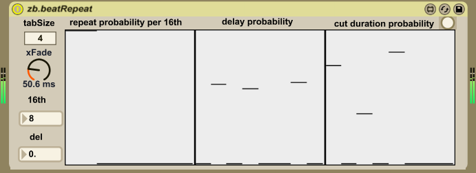 | Description: | zb.beatRepeat is a resampling audio effect, it regards the incoming audio in 16th slices, based on the Ableton Live tempo. These slices can then be repeated according to three different distribution probability curves. The leftmost table represents a sequence of 16th notes. Each bar represents the likelihood of repeating a previous beat at that moment in time. Based on the size of the table this probability pattern can be in sync with the bars but can also phase in and out with the bars. The middle table represents the slices from the past. The bars determine the likelihood of these slices to be chosen. The rightmost table shows the probability distribution defining the duration of each occurred slice. The xFade parameter sets the duration of crossfades when slicing. The tabSize parameter sets the length of the repeat probability sequence, i.e. the leftmost table. |