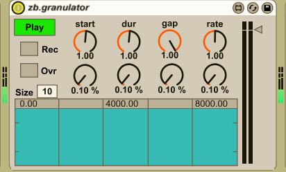 | Description: | zb.granulator is an audio effect that granulates any signal recorded into its buffer. The properties of the playback can than be randomised over time. The size parameter controls the size of the buffer in seconds. The rec button triggers the recording. The ovr button clears the buffer. The play button plays back the contents of the buffer (looped). The start parameter controls the start position of the sample in the buffer. The dur parameter controls the duration of the playback from the start point (a value of one plays and loops the exact size of the buffer. Values larger than the buffer size insert silence between loops. The gap parameter controls the size of the gap between consecutive grains. The rate parameter controls the speed of playback. The bottom row of dials controls the amount of random jitter of the values of the parameters in the top row. The level slider controls the output volume of the device. |