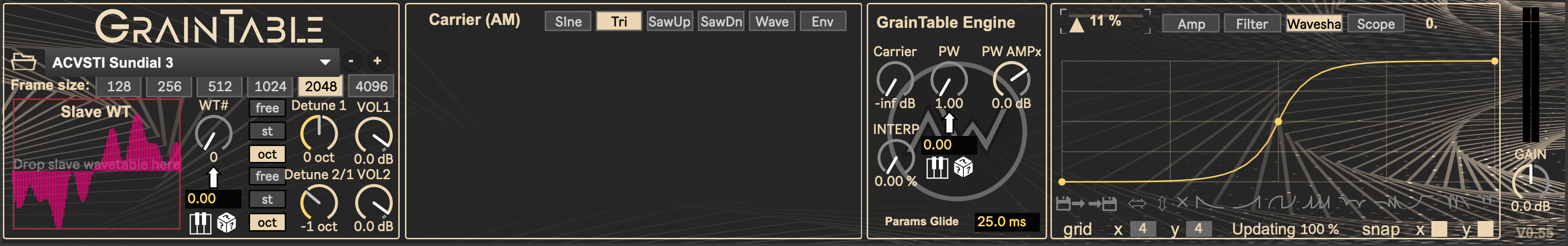 | Description: | As the original Virus TI/TI2 slowly gets older (meanwhile losing compatbility for its software under macOS since 2019, and the manufacturer seems to be shipping its last remaining units), and the computers growing more powerful, people are nontheless still trying to recreate some of the original sounds of the unit, especially the Graintable mode and Formant modes, that actually have nothing to do with granular synthesis of formant filters. From bubbles to sync-style aggressive leads, this mode has been at the heart of psytrance sounds for many years, influencing the tracks up to now. GrainTable recreates as much as possible the sound achieved by the Virus TI2 graintable mode, sought by many. Here's what you get: Slave wavetable - Click on the folder icon to open a folder containing any set of wavetable files (up to 256 per folder), - Or drop a wavetable straight on the waveform display - Select the wavetable size (depends on your source material, Serum wavetables are mostly 2048 samples for example) - Select the wave number. You can add a note-on random value to it, so that each note pressed will vary the wave position positively or negatively - The slave wavetable comes with two alternating oscillators: each one play during 1 cycle of the main oscillator, the other one then plays the next cycle, so they don't play at the same time. - For each of the alternating oscillators, select it pitch as a detune value from the incoming note: for example if a midi note come in at C2 and the detune is +1 st, it will play at C#2. Note that the original sound from the Virus seems to use 0 for slave 1, and -1 octave for slave 2 (hence the default values). - Note that the detune of the second oscillator is set from the first one, so it follows its changes Carrier (AM): - The carrier is a third oscillator which signal will be used as an Amplitude Modulator for the sound coming from the slave wavetables. It's somehow an audio rate envelope - The carrier can be used with different types of signals - Sine/Tri/Sawup/Sawdown are pretty self explanatory. Note that triangle usually provides the smoothest sound, and the closest to the original Graintable of the Virus (hence the default value) - Wave allows you to drop a wavefile onto the carrier - Env allows you to draw your own waveform. It's my own quite advanced version of the envelopes you see in stoc, devices, where you can import and export your waveforms to a file for later reuse. - If needed you can add plain carrier signal to your sound in the graintable section (typicially to fatten it) GrainTable Engine: - The master knob here is the PW for Pulse Width. It will "compress" the slave wavetables (shift their frequency up but not only) without altering the carrier one, giving this sync-like sound. A note on random is available for this param so that each incoming note changes the PW value - The PW Amp+ will change how much louder or quieter each subsequent cycle of the slave oscillator will play when they are compressed: as when PW grows up, more cycles of each slave are played inside one cycle of the carrier, their volume can be tweaked - Interpolate wil allow you to tame the output signal if too harsh: this really depends on your source material, some digital wavetables can be quite aggressive - The Glide slider will smooth value changes in the PW knob and the WT# as well for a less step-ish sounding result. General section: In the last section you will find classic elements: - an ADSR envelope, with a velocity sensitivity slider, and a level knob, plus a filter mix to blend the filtered sound in - A multimode multislope filter, with a note on random knob for the cutoff frequency - A waveshaper that will allow you to blend more gtittiness in your sound, with its mix knob as well. It's by default on a S-shape, that adds nice saturation to it. As much as possible try to keep the center point as it is, and avoid putting a vertical line in the center position, as it's the one that corrersponds to 0.0 in the signal (anyway the device includes a DC offset remover), or you will get very gritty stuff - A scope, synced to your midi input to see what's going on in the device. - And finally an output volume knob to boost or attenuate if needed Full walkthrough by the talented Ollie here: https://youtu.be/H5fo-RBf5W0 Tested under Live 10.1.41+ and Live 11 |