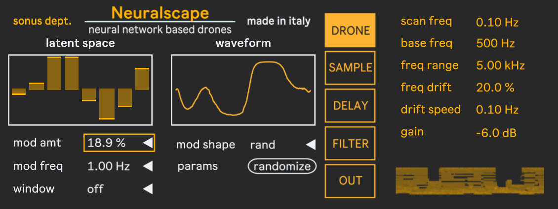 | Description: | Part of Neuraloot bundle, a series of devices build around a custom neural network that generates a complex and evolving waveform. A pocket drone generator, where an oscillator bank and a sample player are driven by the neural wave, creating evolving and thick soundscapes. |