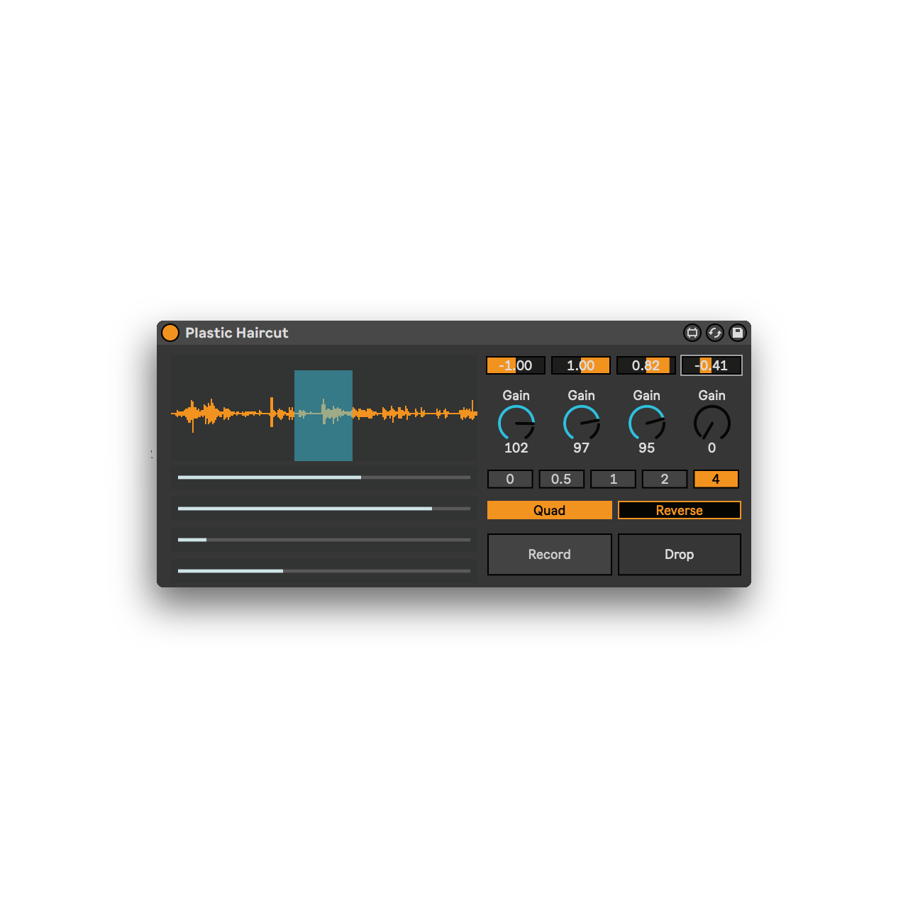 | Description: | Plastic Haircut is a time drifting phase plugin that replicates the early experiments of composer Steve Reich. Record or load audio into the plugin and select a region to loop. Plastic Haircut makes either 2 or 4 loops, each of which are cut slightly shorter than the loop before it, resulting in complex but beautiful phasing melodic rhythms. Perfect for finding interesting rhythms as seeds for a larger track, intros/outros, or creating always evolving ambient drones with reverb. Always looking for tips, so comment or shoot me an email if you need a feature added. ggrainer@protonmail.com |