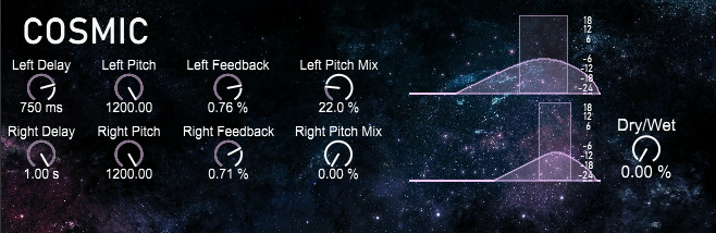 | Description: | Cosmic is a stereo delay with a band-pass filter and pitch-shifter in the feedback loop. Use it to make guitars and keys wide and sparkly. Or, get experimental and mangle drum loops, vocals, and more. The band-pass filters control the left (top of the interface) and right (bottom of the interface) signals independently, and have gain, frequency, and q-factor controls. Please let me know how this device works for you, and any feedback (lol) you might have. Thanks! |