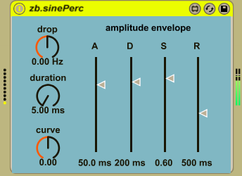 | Description: | zb.sinePerc is a percussion instrument based on a sine wave oscillator whose frequency can be swept. The device is velocity sensitive. The drop parameter controls the extent and direction of the frequency sweep of the sine wave oscillator. The duration parameter controls the duration of the sweep in milliseconds. The curve parameter controls the exponent of the sweep curve. The Amplitude Envelope parameters control the attack, decay and release times as well as the sustain amplitude of the envelope. |