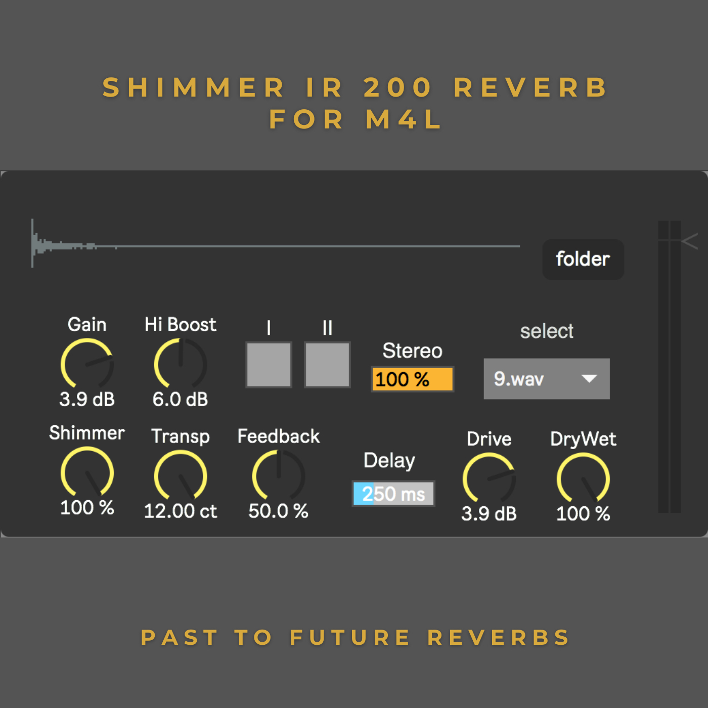 | Description: | ShimmIR 200 REVERB FOR M4L! For all the shimmer reverb lovers out there! We have combined Convolution Reverb with Shimmer and Juno Chorus simulation plus input and output drive simulations to get this amazing sounding reverb. Our goal was to make the shimmer as organic as it gets without sounding digital as most of the shimmer reverbs out there For the IRS we have used our beloved Lexicon 200 Concert Hall IRS (12 IRS from 1-Low decay time to 12 Long decay time) 12 IRS in Total How to Install: drag and drop the ShimmerIR.amxd file to your reverb send in ABLETON LIVE and click on the File button on the GUI to show where the IRS Folder is (IRS For ShimmIR Reverb Lexicon 200 Concert Hall) You can put this folder wherever you want! Check out the demo! https://youtu.be/TogoskZ-Zwg Enjoy another rare Past To Future Reverbs release! |