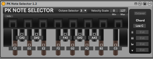 | Description: | Modifies each pedal to output a selectable note and velocity scaler. Setup: Select the octave from the dropdown menu that corresponds to the one selected on the PK Dynamic MIDI Pedal. Choose a minimum and maximum for the velocity scale. Assign each pedal a note from C-2 to G8. All parameters are mappable. Notes can be assigned by manually entering a note as a number (i.e 60), alphanumerically (i.e. C3), dragging the mouse, using automation, or toggling the learn button above the note box and sending MIDI to the device. Version 1.2: Octaver and Chord functions. Octaver function works the same way it does natively on the PK; adds a note an octave above unlesss the added note would be above G8, in which case it will add a note an octave below. The Octaver function happens after the Chord. Chord function works by adding up to 4 additional notes to the corresponding pedal note played. Each pedal can be selected and assigned its own chord voice. Notes can be -48 to +48 semitones from the root note. |