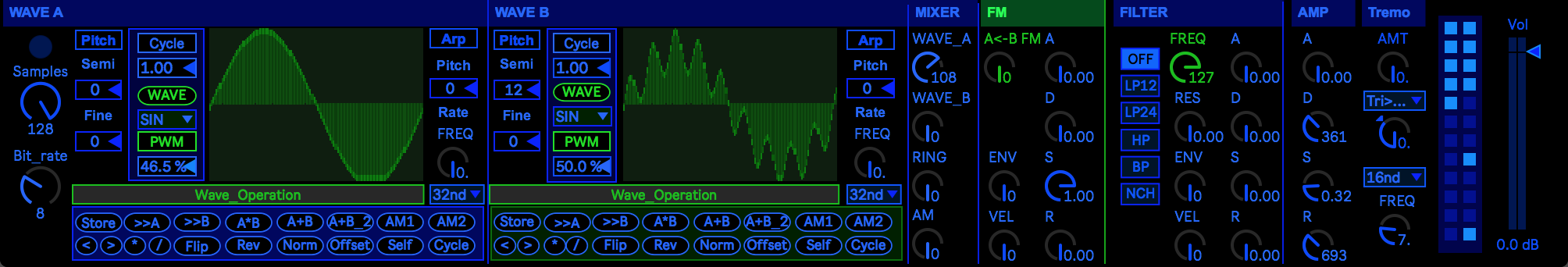 | Description: | This device is wave memory synth(chip tune synth) like an old 8bit console before FM synth appearance. Ver0.2.1 Add table Preset Add more table editing. Add FM. OldVer https://maxforlive.com/library/device/7626/wave-memories |
